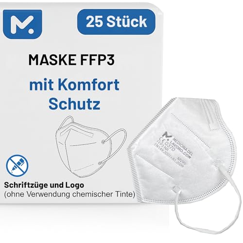 25 FFP3 Mund- und Nasenschutz Maske mit EC Zertifizierung, 5 Lagige Maske ohne Ventil, Staub- und Partikelschutzmaske, medizinische Schutzmaske mit hoher PFE-Filtereffizienz ≥ 99, 25 Atemschutzmaske