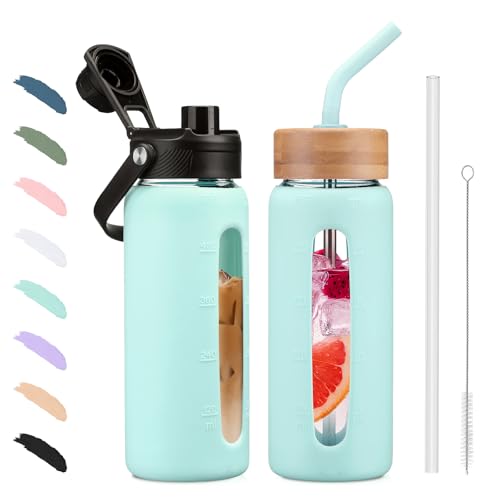BLUEGO 600ml Glaswasserflasche mit Strohhalm und 2 Deckeln Kaffeetasse aus Glas mit Zeitmarkierung und Silikonschutz Glasbecher für Getränke Soda Cola BPA-frei, Hellblau