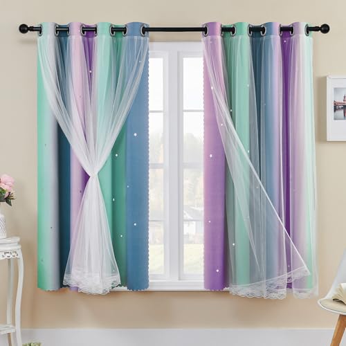 XiDi Natürlich Verdunkelung Thermo Sternenmuster | Grün-Blau-Violett 132x137cm für Kinderzimmer mit Lochblenden & Schleierstoff Gre/Blu/Pur/132/137/2