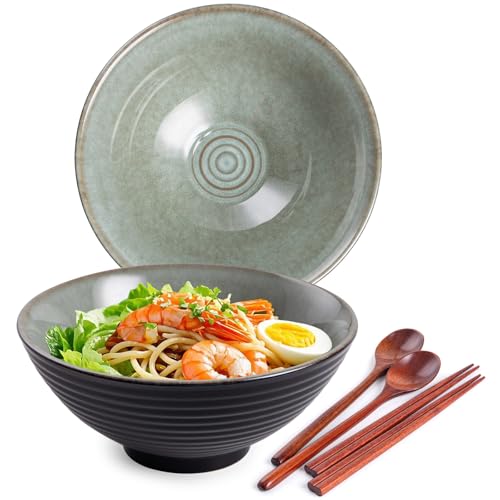 Auanlay 2 x 1200ml Ramenschüssel aus Keramik mit Essstäbchen und Löffeln, 20cm Bowl Schüssel Suppenschüssel Groß (Graugrün)