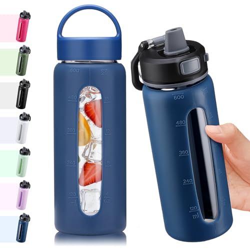 BLUEGO 600ml Glas Wasserflasche mit 2 Deckeln- One-Touch Verschlussdeckel und Griffdeckel Wiederverwendbare Trinkflasche mit Zeitskala für Reisen Zuhause Fitnessstudio Sport BPA-frei, Dunkelblau