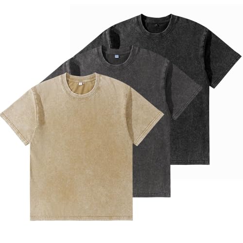 Herren Oversize T-Shirt 3er Pack Baumwolle Sommer Retro Washed Fashion Hip Hop Vintage Casual, Small