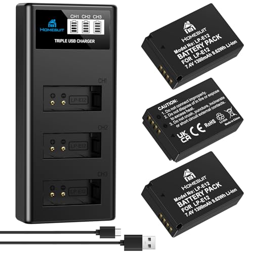 Homesuit LP-E12 Akku 1300mAh und 3-Slot LCD Ladegerät für Canon EOS M50, M50 Mark II, M, M2, M10, M100, M200, Rebel SL1, PowerShot SX70 HS Digitalkameras (3er-Pack)