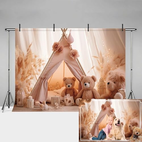 MEHOFOND Boho-Fotografie-Hintergrund, 2,1 x 1,5 m, Pampasgras, Blumen, Zelt, Bär, Dekoration, Fotohintergrund, Kindergeburtstag, Party, Kuchen, Smash, Studio-Requisite